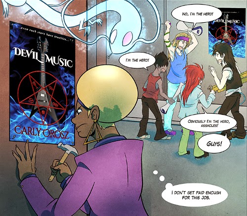 As Carly was finishing up the final draft of Devil Music and starting to look for a professional editor, we started brainstorming what to do with it. The characters have some good chemistry to them which lends itself towards some comedy, and Carly had at one point considered trying to do the entirety of Devil Music as a graphic novel. So we settled onto the idea of a web comic to bridge the narrative gap between the end of the Devil Music book and the beginning of its sequel.